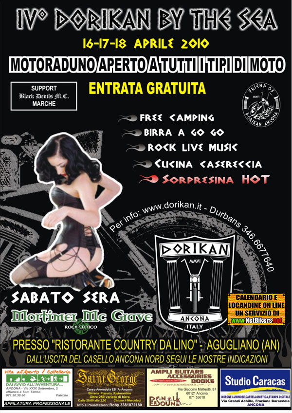 Buona birra, ottima cucina marchigiana e belle ragazze saranno come sempre le protagoniste del nostro raduno che quest'anno si svolgerà in una bellissima location in mezzo alla verde campagna. Non mancheranno comfort come area tende in mezzo a soffice erba e sempre in ombra , ristorantino tipico con prezzi convenzionati per chi volesse comunque di più della nostra buonissima porchetta, area coperta e possibilità di alloggiare in alberghi vicini....il tutto servito in stile Dorikan naturalmente. SABATO SERA IN ESCLUSIVA I "MORTIMER MC GRAVE" CON IL LORO ROCK CELTICO E LA CONSUETA SORPRESINA HOT PER ARRIVARE è molto facile: dall'uscita del casello ANCONA NORD prendere indicazioni per JESI - ROMA, successivamente uscire a MONSANO e girare subito a sinistra. Da li poche curve e sei arrivato!!! NON MANCHERANNO LE NOSTRE INDICAZIONI STRADALI. PER INFO WWW.DORIKAN.IT o DURBAN'S 346 6677640