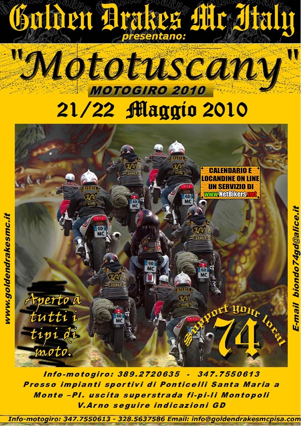 Dal 21 al 22 Maggio MOTOTUSCANY 2010 golden drakes MC presso santa maria a monte provincia di pisa evento aperto a tutti i tipi di moto. bike show , live music drink and food tutta la notte url: www.goldendrakesmc.it