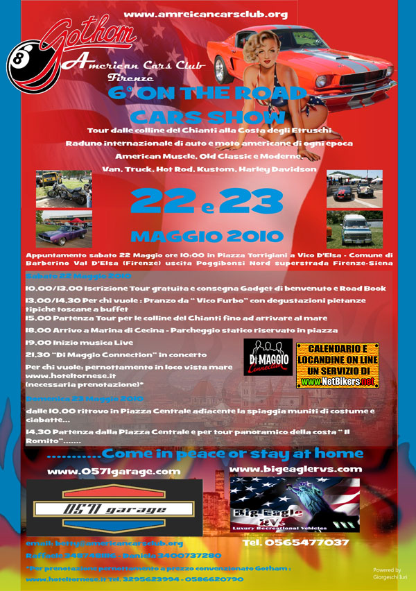 22 Maggio 2010 6th On The Road Cars Show 2010 Tour dalle colline del Chianti alla Costa degli Etruschi Raduno internazionale di auto e moto americane di ogni epoca organizzato dal Gotham American Cars Club Firenze Appuntamento ore 10:00 Vico D'Elsa - Comune di Barberino Val D'Elsa (Firenze) uscita Poggibonsi Nord superstrada Firenze-Siena