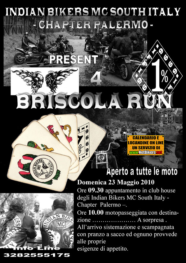 Ore 09.30 appuntamento in club house degli Indian Bikers MC South Italy - Chapter Palermo –. Ore 10.00 motopasseggiata con destinazione...A sorpresa . All’arrivo sistemazione e scampagnata con pranzo a sacco ed ognuno provvede alle proprie esigenze di appetito Per Info: 3282555175