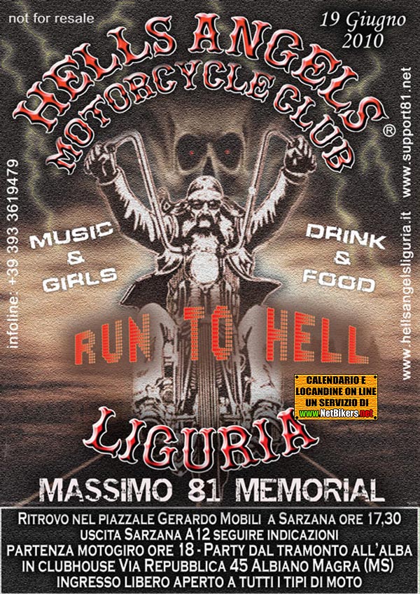 Run to Hell - Hells Angels Liguria Ritrovo ore 17.30 nel piazzale Gerardo Mobili a Sarzana, seguire indicazioni dall'uscita A12 casello Sarzana. partenza motogiro ore 18 arrivo in clubhouse e Party dal tramonto all’alba Drink - Food - Girls - Live Music- DJ SET ore 23 concerto rock blues ingresso libero aperto a tutti i tipi di moto per chi ci vuole raggiungere direttamente in clubhouse: Via della repubblica 45 Albiano magra (ms) COME ARRIVARE: Uscita La Spezia autostrada A12, dopo il casello proseguire svoltando a destra verso Santo Stefano Magra, seguire la super strada ed alla seconda rotonda svoltare a sinistra verso Aulla. Seguire la statale attraversando la frazione di S.Stefano e la località Bettola. Dopo poco svoltare a sinistra ed imboccare il ponte che attraversa il fiume Magra. Proseguire per circa 1 Km e sulla sinistra troverete un ampio parcheggio e la discoteca Jungle Music Safari, il red & white club si trova sotto la discoteca. dalle ore 20 cucina tipica ligure drink, cocktails e musica di intrattenimento ore 23 concerto a seguire Dj set e ragazza immagine danzante