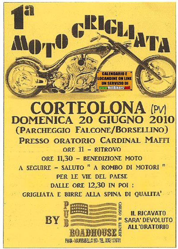 20 Giugno 1 Motogrigliata a Corteolona (PV) Dalle Ore 11 Ritrovo 11,30 benedizione Moto a seguire giro per il paese e poi Grigliata naturalmente con Birra.