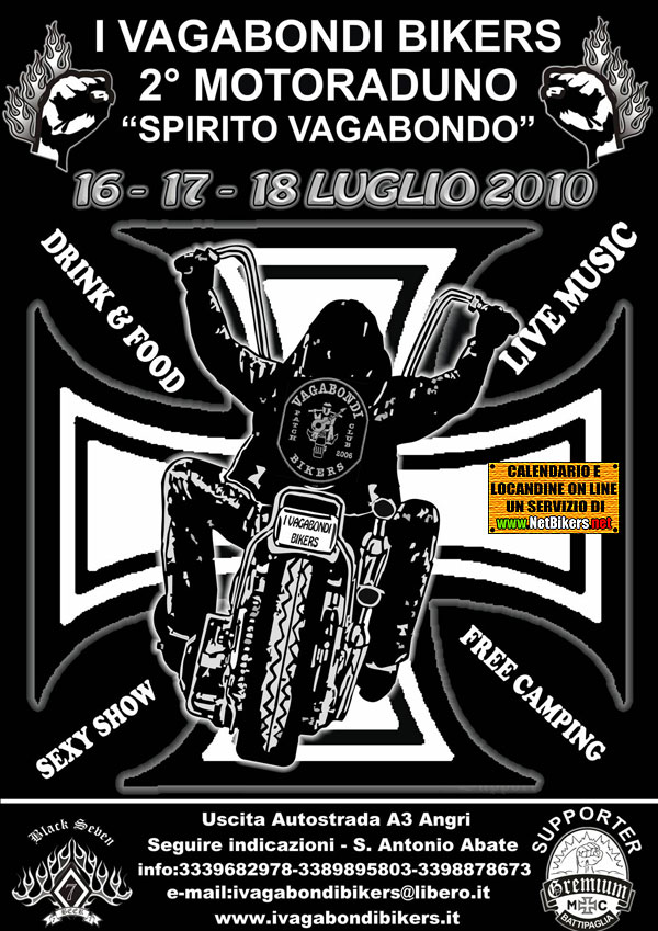 I VAGABONDI BIKERS presentano 2° Motoraduno "Spirito Vagabondo" che si terrà a Sant'Antonio Abate (NA) all'insegna del "Rispetto, Amicizia, Fratellanza" che accomuna noi bikers. Food & Drink,Bike Show,Free Camping, ottima birra Black Seven. Domenica 18 Run sui Monti Lattari che terminerà con Pranzo all'Hotel Rist Elisabetta di Lettere(NA), x il pranzo sono gradite prenotazioni almeno una settimana prima dell'evento.