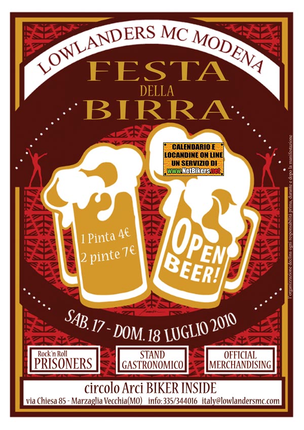 I Lowlanders MC Modena sono lieti di invitarvi alla consueta Festa Della Birra che si terrà in clubhouse a Modena in via Chiesa 85 – Marzaglia(MO). Stand gastronomico - Birra - Merchandise - e lo scoppiettante Rock 'n Roll dei Prisoners. Vi Aspettiamo assetati e con voglia di fare festa ! Per info 335/344016
