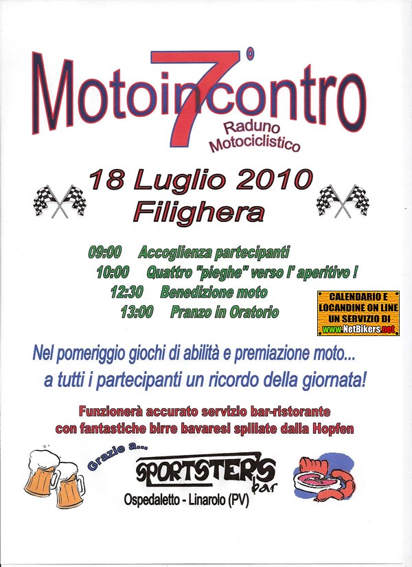 09:00 Accoglienza partecipanti 10:00 Quattro "pieghe" verso l'aperitivo 12:30 Benedizione Moto a seguire pranzo Nel pomeriggio giochi e premiazioni Moto a tutti i partecipanti un un ricordo della giornata. Servizio bar-ristorante e Birra Bavarese alla spin
