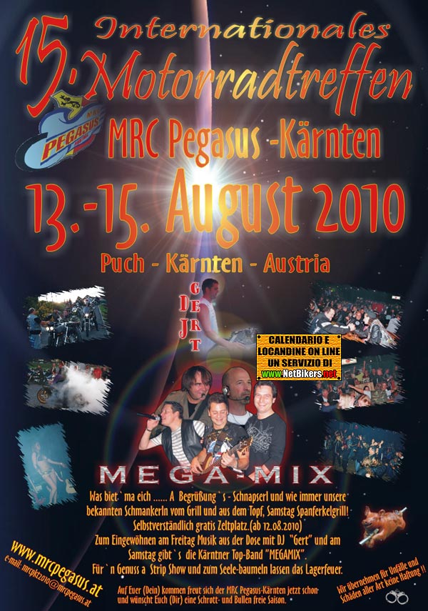 Es ist wieder bald so weit, wir der „MRC PEGASUS Kärnten“ möchten Euch (Dich) auf diesem Weg zu unserem Motorradtreffen einladen! Auf Euer (Dein) KOMMEN freuen wir uns jetzt schon und wünschen eine kurvenreiche und unfallfreie Saison.... Infos: mrcpkt2010@mrcpegasus.at www.mrcpegasus.at Bikergruß „MRC PEGASUS Kärnten“