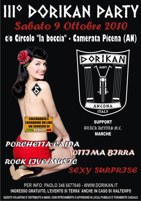 09 Ottobre 2010 Il 9 ottobre terzo party dei Dorikan Ancona. La festa si svolgerà nella stessa location dell'anno scorso e sarà caratterizzata dalla nostra immancabile ed ineguagliabile porchetta appena fatta, dalla maxi fagiolata, birra e vari drink di ogni genere e naturalmente dalla sorpresina finale per riscaldare gli animi...ospitalità ed accoglienza naturalmente in stile Dorikan. dal casello A14 ANCONA NORD segui le nostre indicazioni Info: Poli - 3466677640 - http://www.dorikan.it