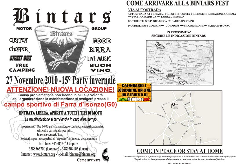 15° Party invernale BINTARS motor group a Farra d'Isonzo (GO) presso campo sportivo" ATTENZIONE NUOVA LOCATION" Food, Drink, Live Music, motogiro e tanta festa come sempre!!! Possibilità di campeggio. info: www.bintars.org mail: bintars@bintars.org