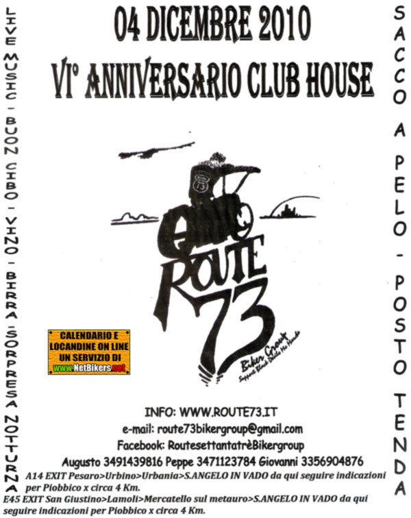 04 Dicembre 2010 6° ANNIVERSARIO CLUB HOUSE ROUTE 73 2010 Motoraduno Sant'Angelo in Vado Pesaro Urbino (PU) Bikers Group c/o la club house a Sant'Angelo in Vado (PU). Live music, buon cibo, yino, birra, calde sorprese, è possibile pernottare presso il club muniti di sacco a pelo ed è anche disponibile il posto tenda.