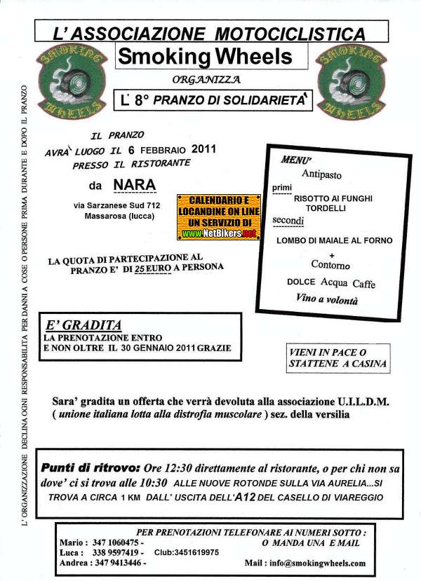 06 Febbraio 2011 8° PRANZO DI SOLIDARIETA' 2011 Motoraduno Versilia Lucca (LU) Organizzato dagli Smoking Wheels Versilia, pranzo il cui ricavato verra devoluto all' assoc.U.I.L.D.M. sez. della VERSILIA (costo 25 euro)ritrovo uscita viareggio dopo 1km alle due rotonde dalle 10:30 in poi. (autostrada GENOVA- ROSIGNANO) www.smokingwheels.com