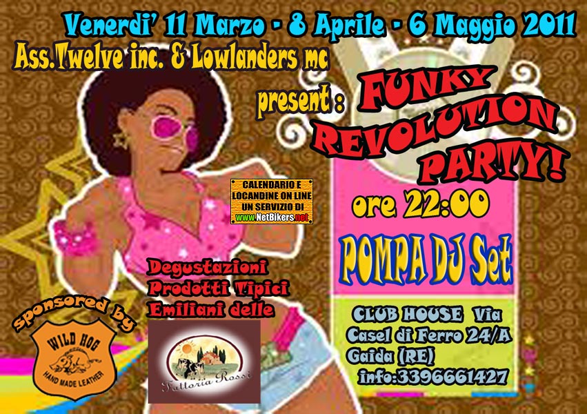 08 Aprile 2011 FUNKYREVOLUTION 2011 Motoraduno Reggio Emilia (RE) Lowlanders MC Party Funky,tanta bona musica con Dj Pompa vi aspetta,locale super,ottimi drink e tanta voglia di far festa....cosa volere di piu'.... (info@lowlandersmc.com)