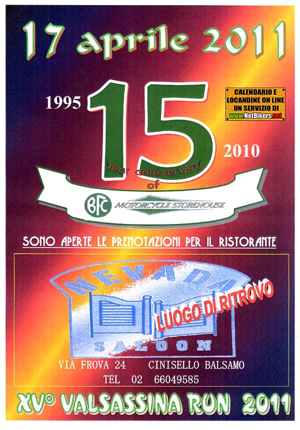 17 Aprile 2011 15° VALSASSINA RUN 2011 Motoraduno Cinisello Balsamo Milano (MI) Ritrovo a Cinisello B. (MI) destinazione Crandola valsassina. E' gradita la prenotazione per il pranzo.