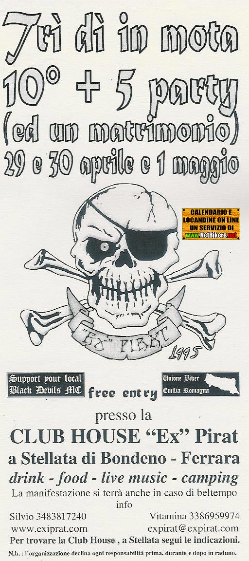 ...ebbene si, gli exPirat sono arrivati alla 15° edizione del loro consueto raduno annuale.. e quest'anno con un evento speciale.. un matrimonio.. se siete curiosi di sapere chi sono i 2 matti.. venite a trovarci.. come al solito buon cibo e birra vi aspettano.. presso la club house exPirat a stellata di bondeno (FE) sabato sera allieteranno la serata i WILDES TIER official cover band Rammstein www.expirat.com