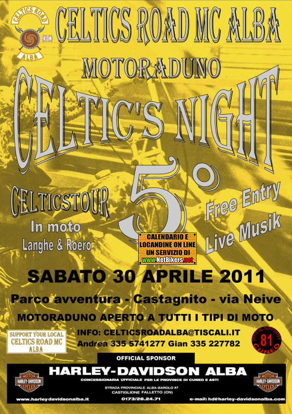 30 Aprile 2011 5° CELTIC'S NIGHT 2011 Motoraduno Cuneo (CN) Musica Birra e cucina casalinga Parco avventura, località baraccone Castagnito direzione Neive Autostrada Asti Cuneo Uscita Castagnito Info celticsroadalba@tiscali.it
